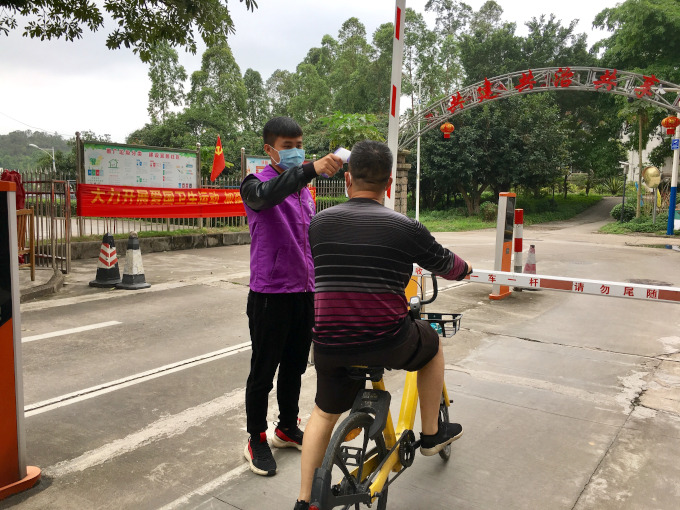 何波在小區(qū)門崗測(cè)量體溫。