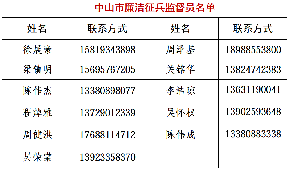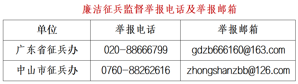 為嚴(yán)明兵員征集紀(jì)律,筑牢廉潔征兵底線,進一步提升征兵工作透明度,中山市征兵辦將2026年我市廉潔征兵監(jiān)督員名單及監(jiān)督舉報電話、郵箱予以公布。廣大市民若發(fā)現(xiàn)征兵違法違紀(jì)線索或廉潔征兵問題,可向廉潔征兵監(jiān)督員反映舉報,也可直接撥打省、市監(jiān)督舉報電話,或發(fā)送郵件至指定信箱反饋。