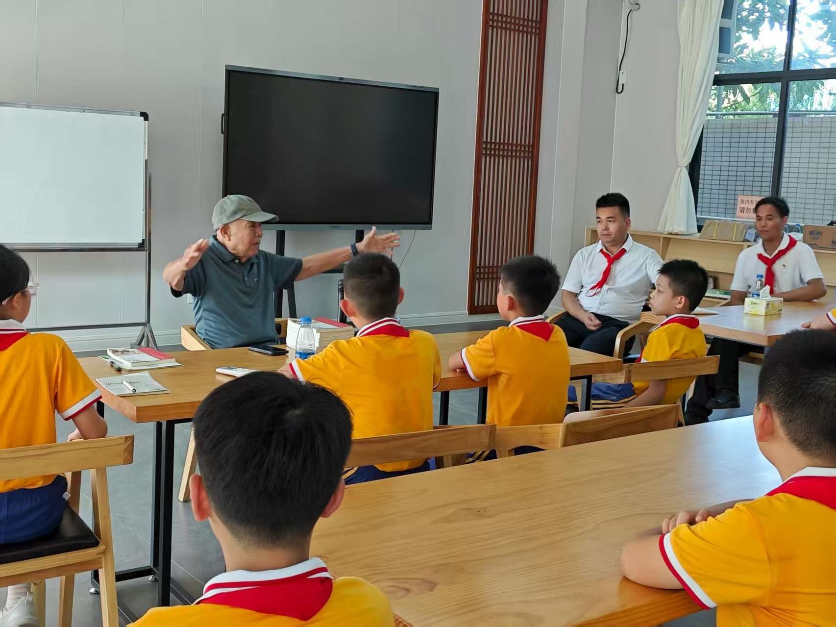 南朗小學(xué)的前身是安定學(xué)校,也是1943年南朗安定戰(zhàn)斗的核心遺址?;顒赢?dāng)日,92歲的老校長程民興受邀來到學(xué)校,他以親歷者的身份為同學(xué)們講述校園經(jīng)歷的抗戰(zhàn)故事,讓過去的歷史多了份可觸的溫度。“日本飛機轟炸安定學(xué)校時,瓦片碎裂的聲響至今仍在耳畔回響,那次轟炸,我險些沒能活下來。”他告訴同學(xué)們,日寇占據(jù)安定學(xué)校后,把兩層教學(xué)樓改造成堡壘,墻外布滿帶刺的鐵絲網(wǎng),槍口日夜對著村口;那時他就躲在閣樓里,親眼看見二樓窗口常年架著機槍,夜里探照燈掃過田野時,全村人都屏息凝神,不敢發(fā)出半點聲響。