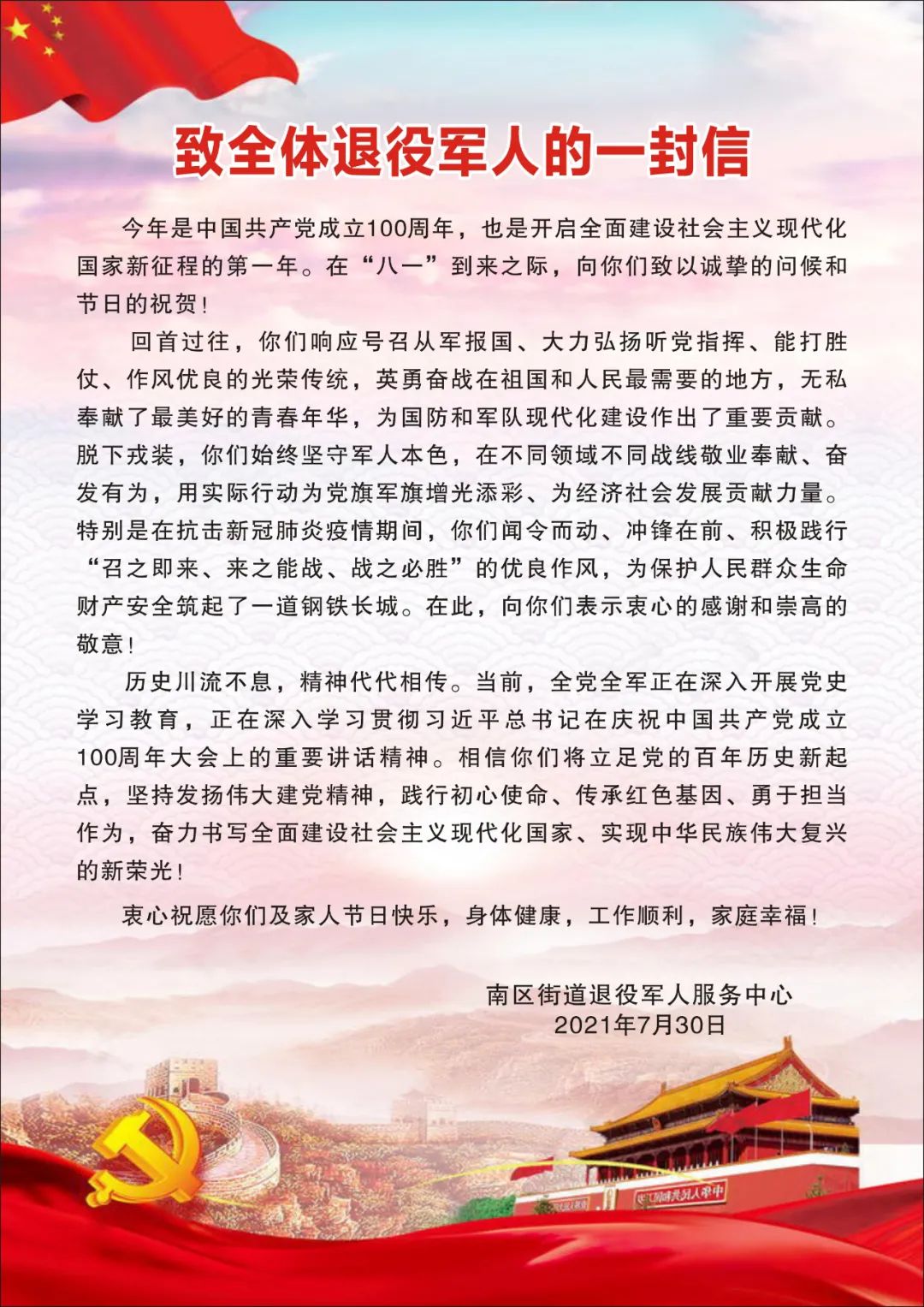在“建軍節(jié)”來臨之際,南區(qū)街道開展一系列擁軍優(yōu)屬活動,懷著崇敬之心、感恩之心,向優(yōu)撫對象和退役軍人、現(xiàn)役軍人家屬表達關懷和謝意,推動軍民共建!
