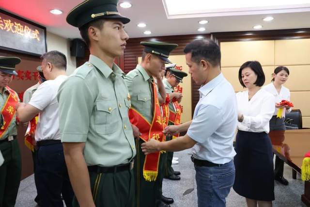 儀式現(xiàn)場,街道領(lǐng)導(dǎo)為退役士兵逐一佩戴象征榮譽的大紅花,致敬他們?yōu)閲朗聵I(yè)作出的貢獻。