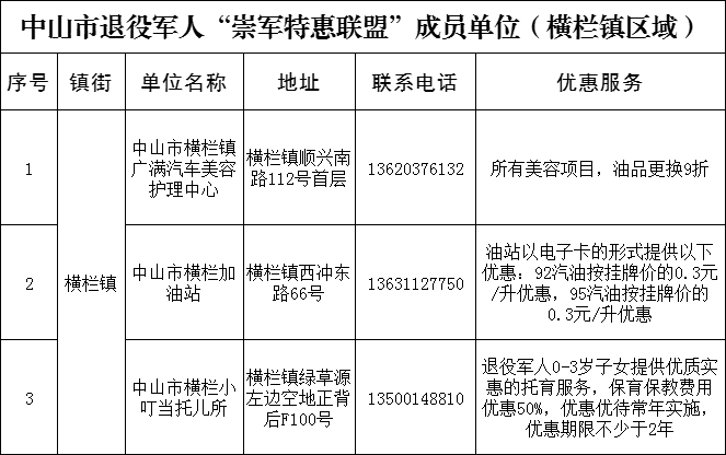 為貫徹落實(shí)習(xí)近平總書記關(guān)于退役軍人工作重要論述精神,加強(qiáng)退役軍人保障工作,我市決定組建中山市“崇軍特惠聯(lián)盟”。橫欄鎮(zhèn)迅速行動(dòng),以“讓退役軍人得實(shí)惠,讓軍人職業(yè)受尊崇”為宗旨,秉持“自愿參與、志愿服務(wù)、優(yōu)質(zhì)規(guī)范、合作共贏”原則,分批次招募聯(lián)盟成員單位,為廣大退役軍人提供價(jià)格優(yōu)惠產(chǎn)品、優(yōu)先優(yōu)待服務(wù)。12月2日,橫欄鎮(zhèn)首批3家“中山市退役軍人崇軍特惠聯(lián)盟”商家正式掛牌。 橫欄鎮(zhèn)副鎮(zhèn)長程輝、鎮(zhèn)公共服務(wù)辦和鎮(zhèn)退役軍人服務(wù)中心等負(fù)責(zé)人分別到橫欄鎮(zhèn)廣滿汽車美容護(hù)理中心、橫欄加油站、橫欄小叮當(dāng)托兒所進(jìn)行授牌。 據(jù)橫欄鎮(zhèn)退役軍人服務(wù)中心負(fù)責(zé)人介紹,凡持有退役證或優(yōu)待證等有效證件的退役軍人,可到目前市內(nèi)102個(gè)“崇軍特惠聯(lián)盟”成員單位享受優(yōu)惠商品和服務(wù)。同時(shí),橫欄鎮(zhèn)將繼續(xù)探索擁軍優(yōu)撫新模式,吸引更多的企業(yè)、商家加入“崇軍特惠聯(lián)盟”,為退役軍人提供更多更好的服務(wù),增強(qiáng)軍人榮譽(yù)感、自豪感,努力營造崇軍的良好社會氛圍,切實(shí)為退役軍人辦實(shí)事、辦好事、解難事,致敬“最可愛的人”。