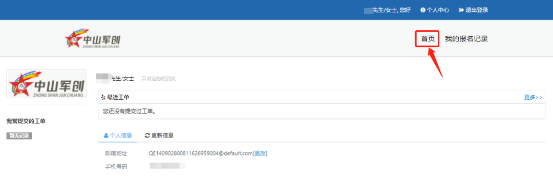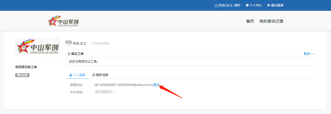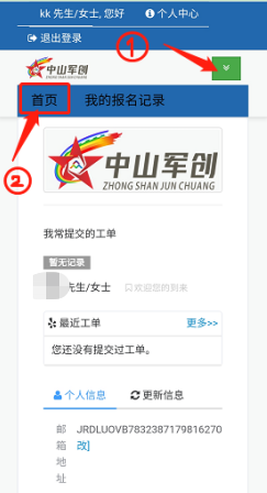 注冊成功后自動跳轉至登錄界面,填寫相應信息后登錄賬號,進入個人中心首頁,將系統(tǒng)默認郵箱更改為個人常用郵箱,方便大賽執(zhí)委會通知發(fā)送。如圖5-6所示: