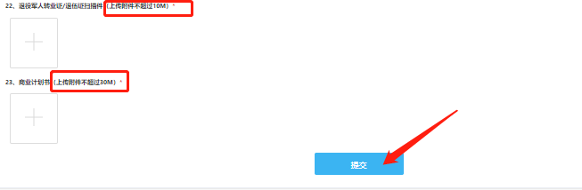 學歷一欄系統(tǒng)默認為“初中”,如需修改,點擊可跳出其他內容選項,按實際情況選擇即可。注意根據(jù)內容提示填寫相應正確信息,有“*”標志的為必填內容,注意退役軍人轉業(yè)證/退伍證掃描件上傳附件不得超過10M,商業(yè)計劃書上傳附件不得超過30M。報名表所有項目內容格式須完全填寫正確才可成功上傳。如圖11-12所示:
