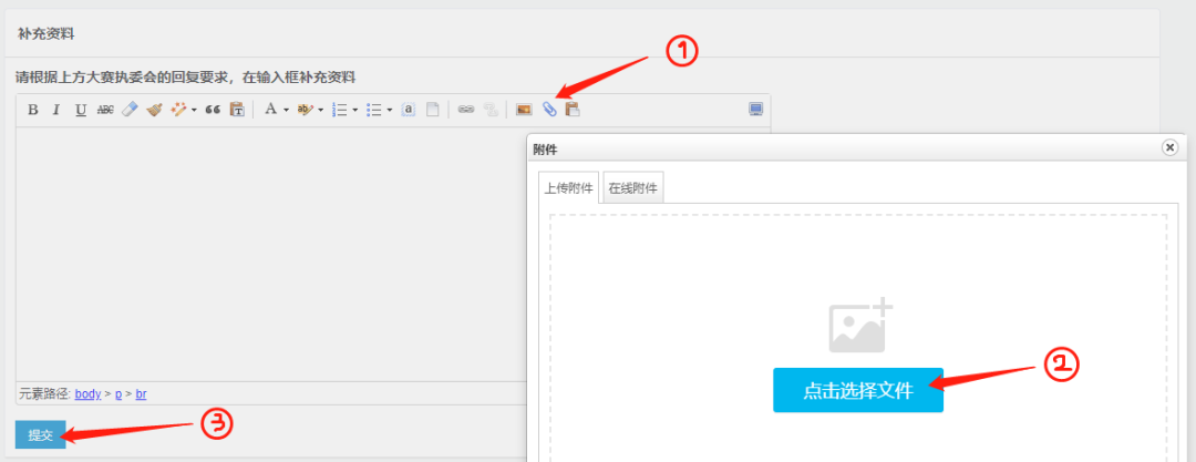若想對已提交的報名信息進行補充,可在登陸首頁點擊“我的報名記錄”,點擊【查看詳情】進入報名表詳情頁面,拉至頁面底部的補充資料欄,點擊回形針圖標添加補充文件,再點擊提交即可。如圖15-16所示: