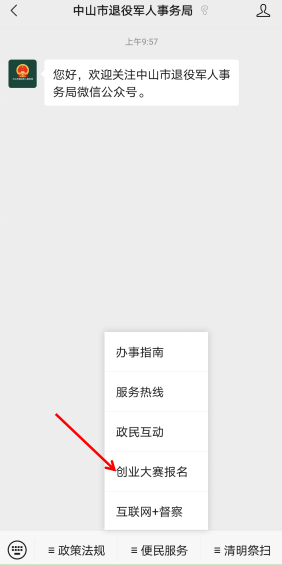 微信搜索“中山市退役軍人事務局”或者掃描下方二維碼,即可關注公眾號。進入“中山市退役軍人事務局”官方微信公眾號,在下方功能欄找到“便民服務”,點擊選擇“創(chuàng)業(yè)大賽報名”即可進入報名系統(tǒng)。如圖17-19所示:
