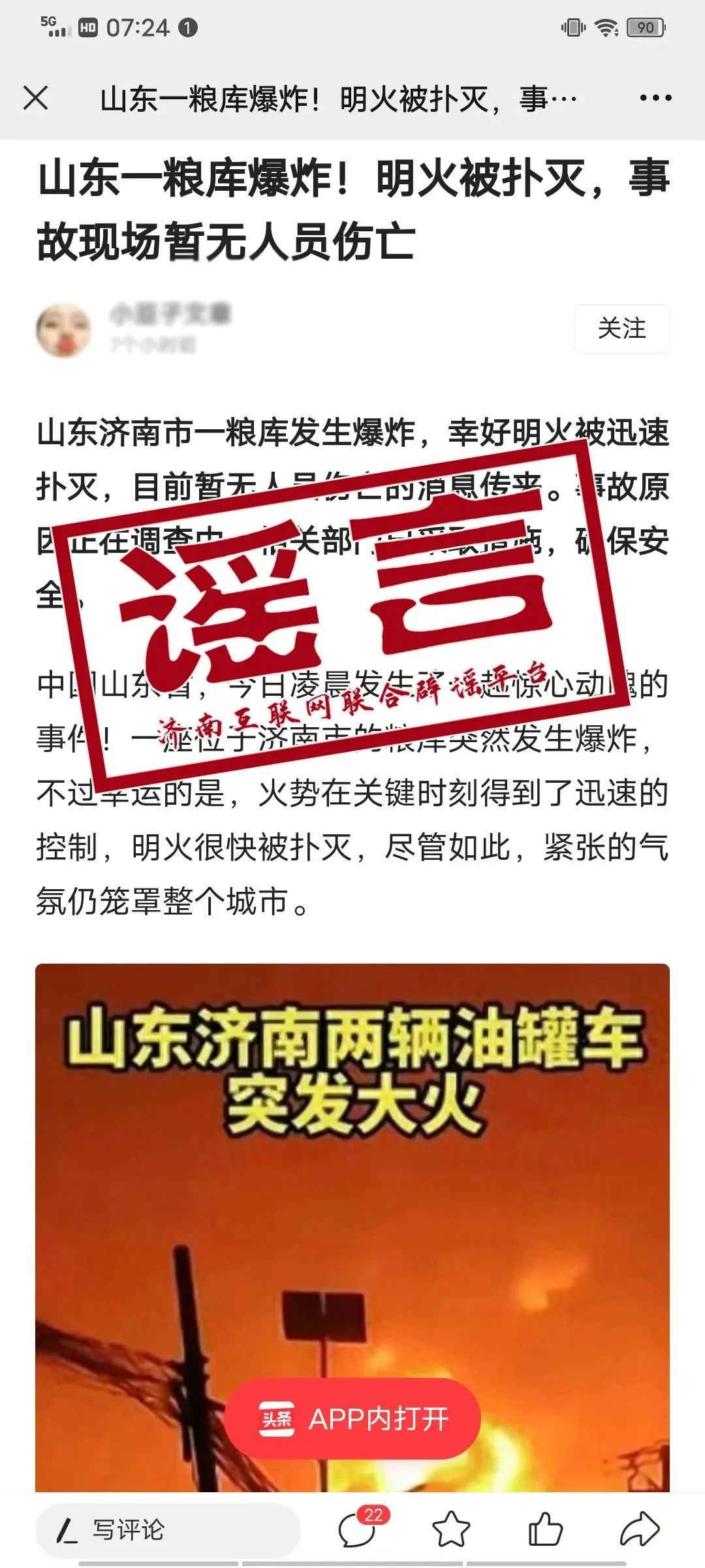 1月20日晚,有網(wǎng)民在社交平臺(tái)發(fā)布“山東濟(jì)南市一糧庫(kù)發(fā)生爆炸?;饎?shì)在關(guān)鍵時(shí)刻得到了迅速的控制,明火很快被撲滅,盡管如此,緊張的氣氛仍籠罩整個(gè)城市”消息,所配圖片顯示為“濟(jì)南兩輛油罐車突發(fā)大火”,引發(fā)了網(wǎng)友熱議。