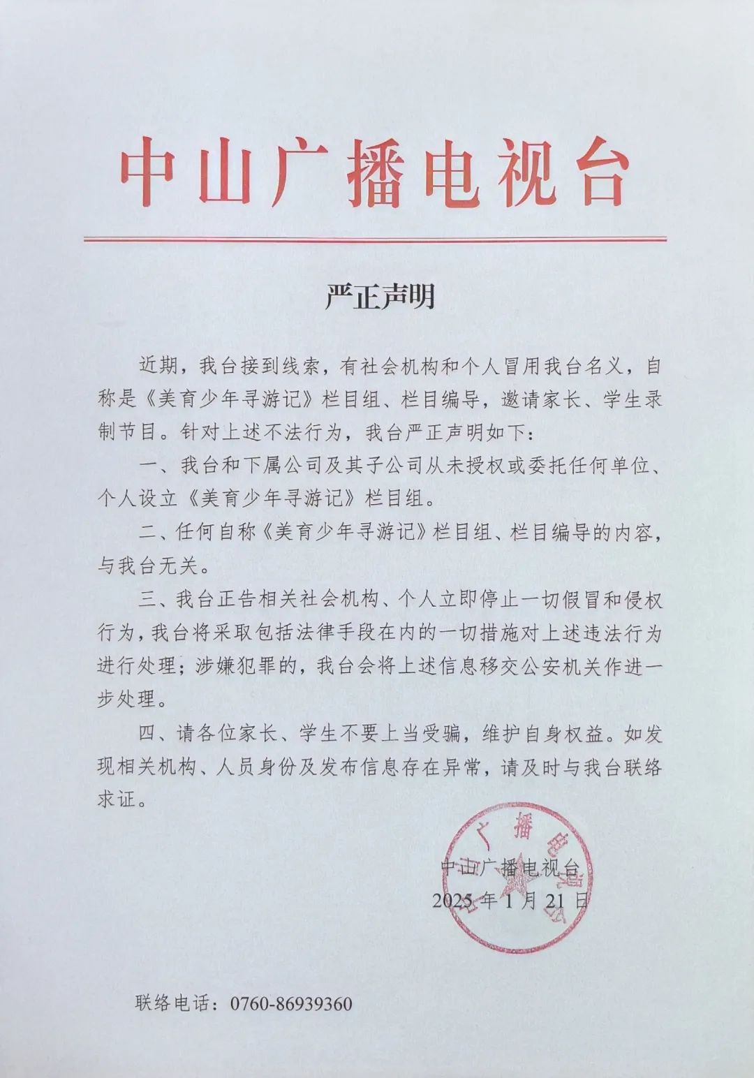 針對(duì)《美育少年尋游記》欄目組的不法行為,中山廣播電視臺(tái)在此發(fā)出嚴(yán)正聲明:
