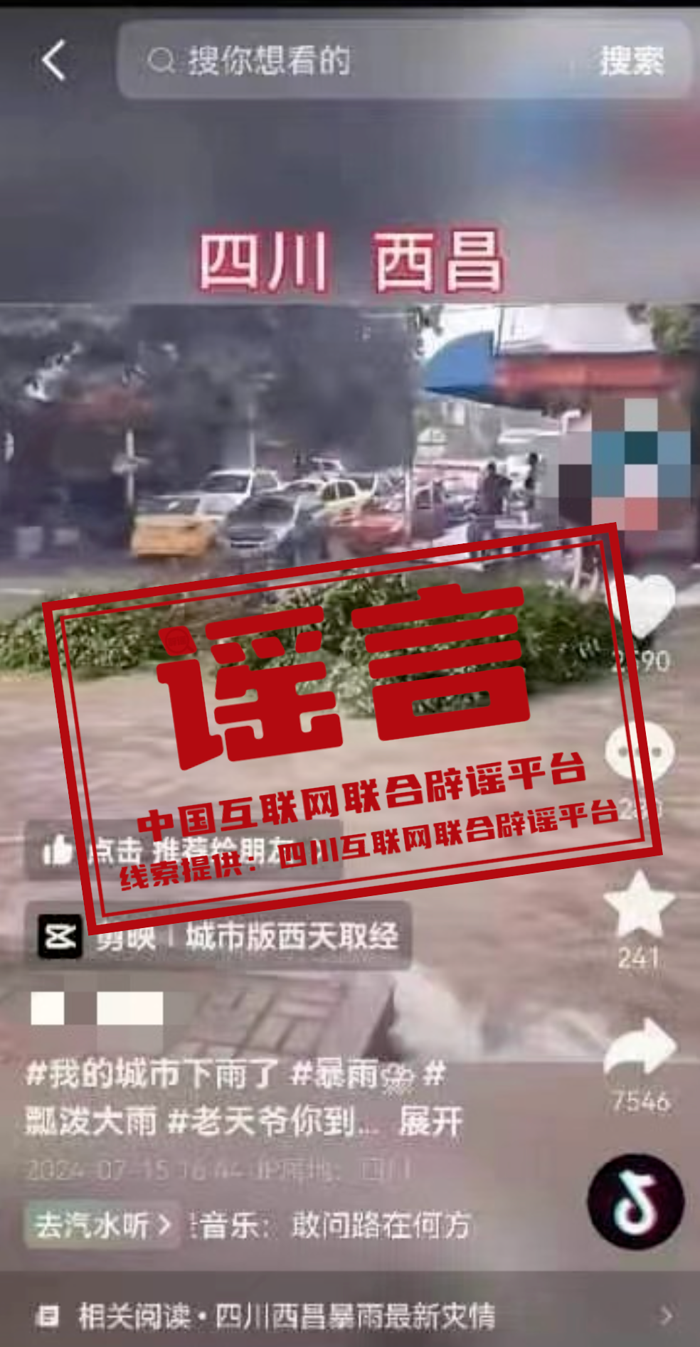 近日,有網(wǎng)民發(fā)布一條視頻,顯示兩人利用被吹斷的大樹枝在街道上乘汛漂流,并在視頻上方標注了“四川西昌”的字樣,引發(fā)網(wǎng)民關注。經(jīng)調查,該視頻系網(wǎng)民蔡某為博眼球、吸流量,利用短視頻編輯軟件上的模板剪輯而成,并在短視頻平臺進行傳播,造成不良社會影響。當?shù)毓矙C關依法對其進行處罰,并已責令其刪除謠言信息。(來源:四川互聯(lián)網(wǎng)舉報辟謠平臺)
