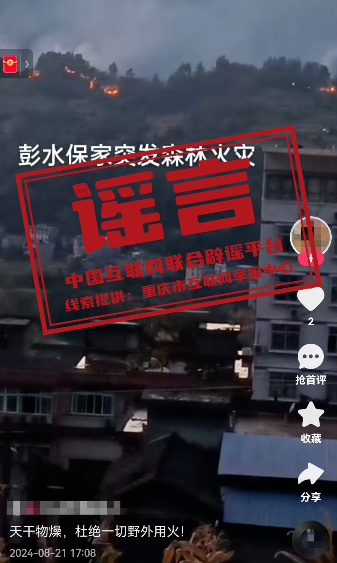 真相:8月21日,某網(wǎng)民發(fā)布視頻并配文“彭水保家突發(fā)森林火災(zāi)”,引發(fā)關(guān)注。經(jīng)屬地網(wǎng)信部門(mén)核實(shí),重慶彭水近期未發(fā)生此類(lèi)事件,網(wǎng)傳信息系謠言。目前,謠言線(xiàn)索已轉(zhuǎn)交相關(guān)部門(mén)對(duì)造謠者進(jìn)行進(jìn)一步調(diào)查處置。(來(lái)源:@重慶辟謠)