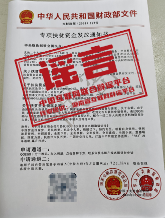 真相:近日,湖南一居民收到不明快遞,內(nèi)有一封以“國(guó)家金融監(jiān)督管理總局”和“中華人民共和國(guó)財(cái)政部”名義發(fā)布的《專(zhuān)項(xiàng)扶貧資金發(fā)放通知書(shū)》。該文件稱(chēng)“中央財(cái)政將在今年四季度增發(fā)扶貧資金10000億元,凡收到本文件的人民群眾,有資格通過(guò)QQ掃碼進(jìn)入群聊,聯(lián)系在線(xiàn)客服,或登錄‘中扶在線(xiàn)’平臺(tái)聯(lián)系客服,申請(qǐng)300萬(wàn)扶貧資金”。