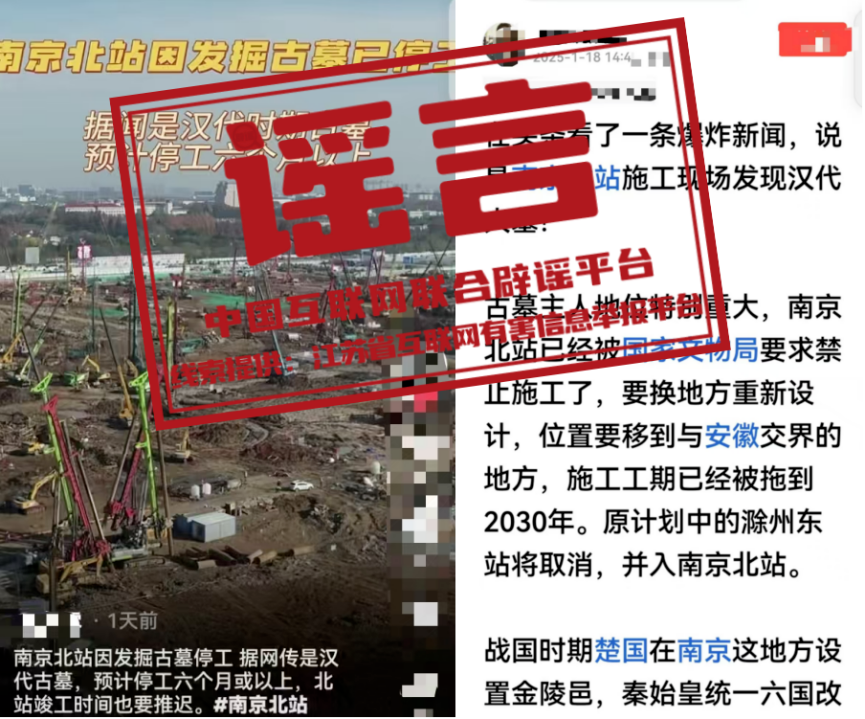 真相:近日,有網(wǎng)民在網(wǎng)絡(luò)平臺(tái)發(fā)帖稱,南京北站因挖到古墓,“已經(jīng)被國家文物局要求禁止施工了”“預(yù)計(jì)停工六個(gè)月或以上”“施工工期已經(jīng)被拖到2030年”等。經(jīng)江蘇省互聯(lián)網(wǎng)辟謠平臺(tái)與省文物部門和屬地核實(shí),目前沒有收到國家文物局關(guān)于“南京北站禁止施工”的有關(guān)通知,南京北站除個(gè)別涉及考古發(fā)掘作業(yè)區(qū)域外,其他施工作業(yè)均按計(jì)劃正常有序推進(jìn),網(wǎng)傳信息系謠言。(來源:江蘇省互聯(lián)網(wǎng)辟謠平臺(tái)、“南京網(wǎng)絡(luò)辟謠”微信公眾號(hào))