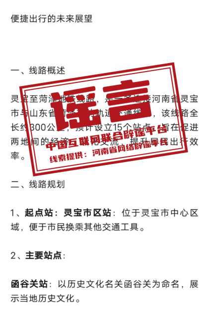 真相:近日,有自媒體賬號在互聯(lián)網(wǎng)平臺發(fā)布“靈寶到菏澤的地鐵”相關(guān)信息,稱“該線路全長約300公里,預(yù)計設(shè)立15個站點”“起點站為靈寶市區(qū)站,位于靈寶市中心區(qū)域”,引發(fā)關(guān)注。經(jīng)核實,該消息系虛假信息?;ヂ?lián)網(wǎng)不是法外之地,請自覺遵守法律法規(guī),不造謠、不信謠、不傳謠。(來源:“清朗河南”微信公眾號、網(wǎng)信靈寶)